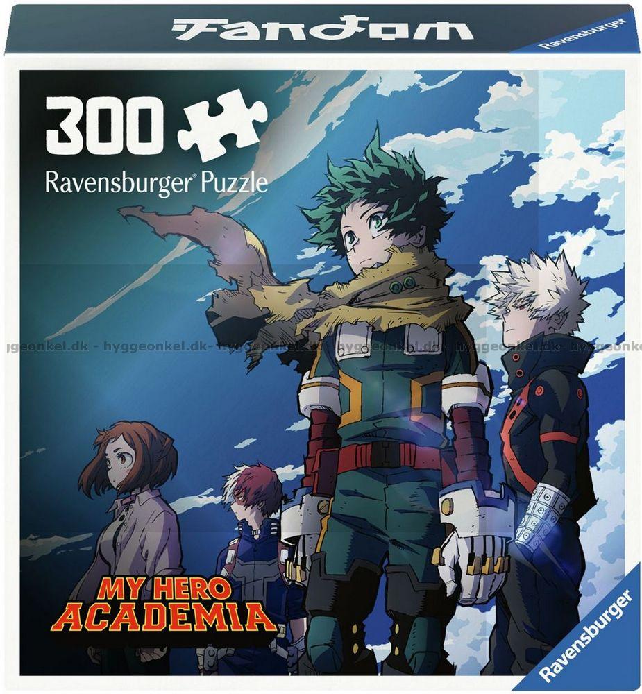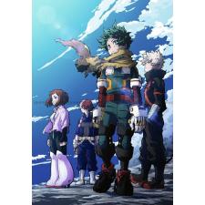 - Izuku Midoriya (Deku) står i sin karakteristiska gröna dräkt och slitna mantel som fladdrar i vinden