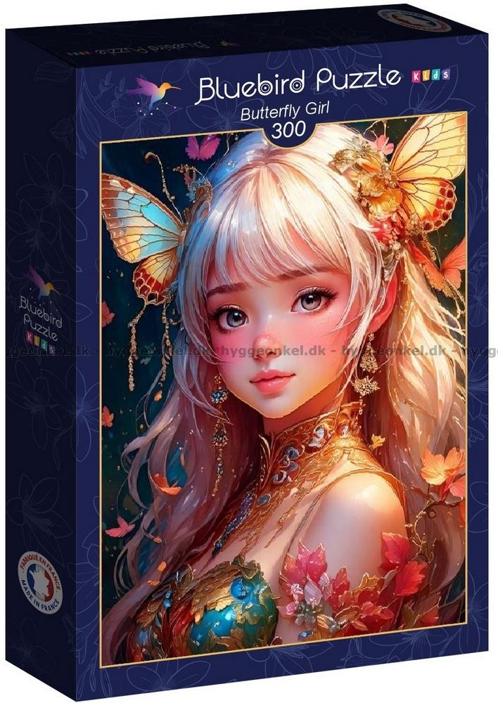 - Hon är omgiven av fjärilar och blommor. Motivet passar bra för vuxna som vill lägga pussel med färre bitar