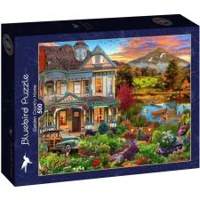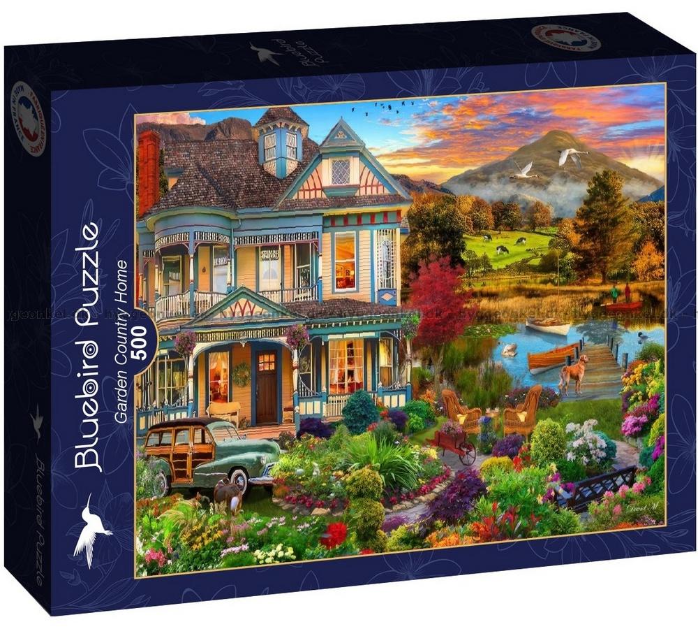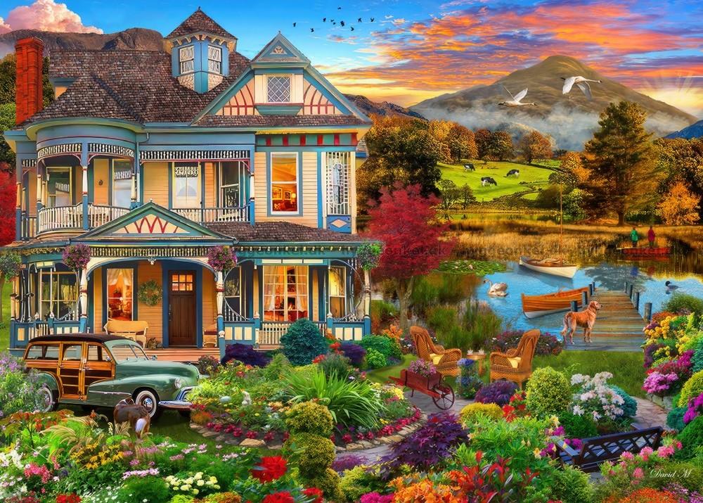 - Ett charmigt lantställe omgivet av en frodig trädgård och en stilla sjö. Solen går ner över de avlägsna kullarna och himlen är fylld av varma färger