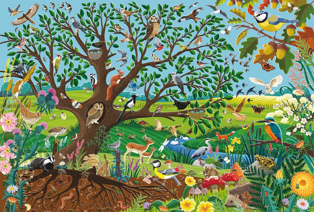 - Trädgården är fylld med olika djur och växter. I det stora trädet bor en rad olika fåglar