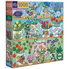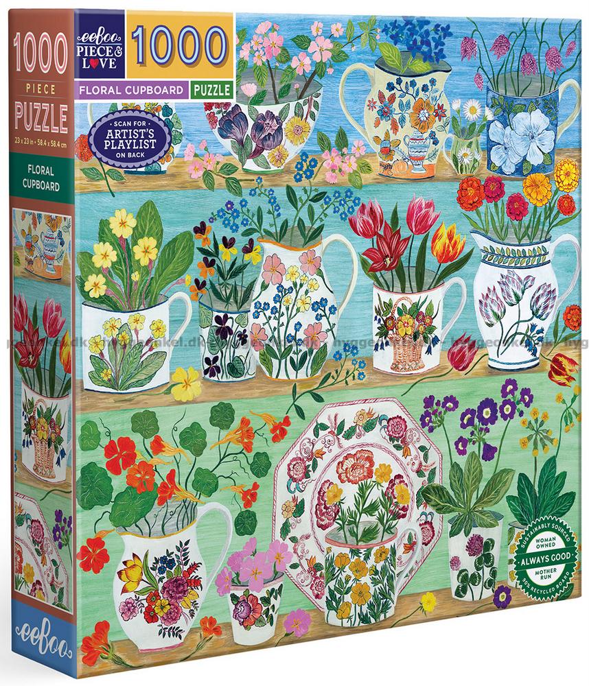 - På hyllorna står dekorativa porslinskoppar fyllda med blommor