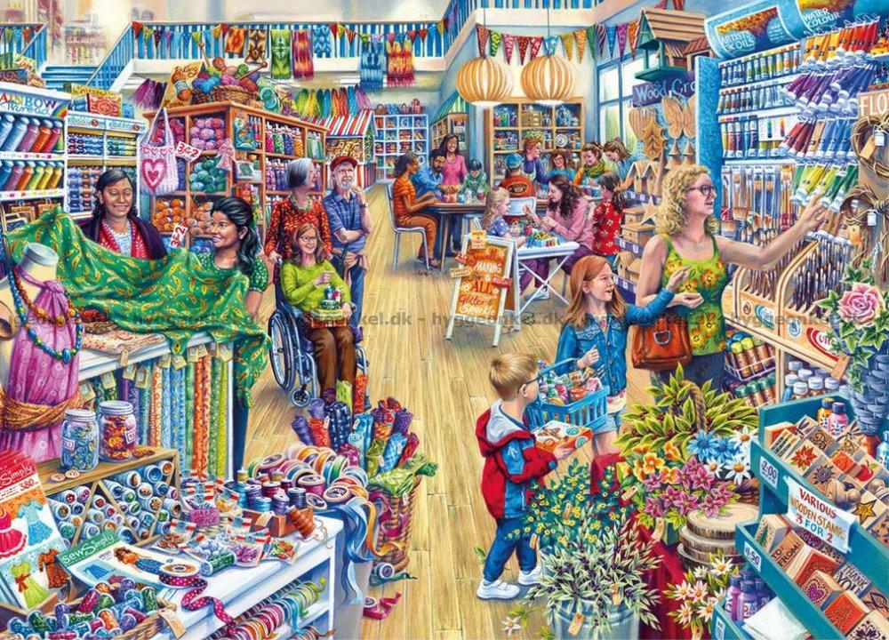 - Hylla och bord är fyllda med garnnystan, knappar och andra fina saker för den kreativa