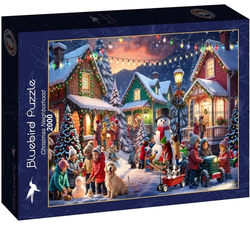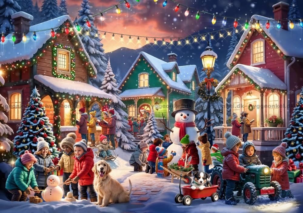 - Barn leker och vuxna myser i det snötäckta grannskapet. Husen är dekorerade med färgglada ljusslingor som lyser upp den kalla vinterkvällen. En snögubbe välkomnar till julmys.