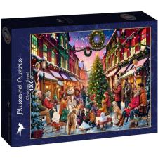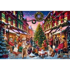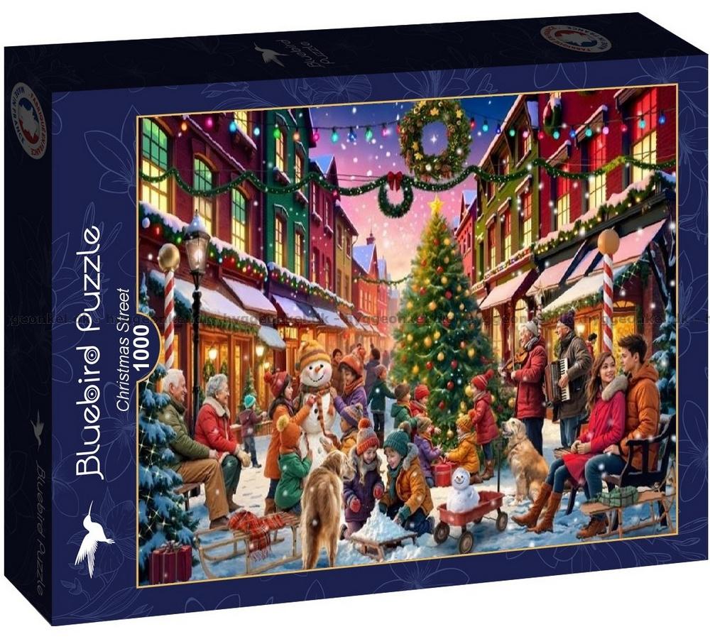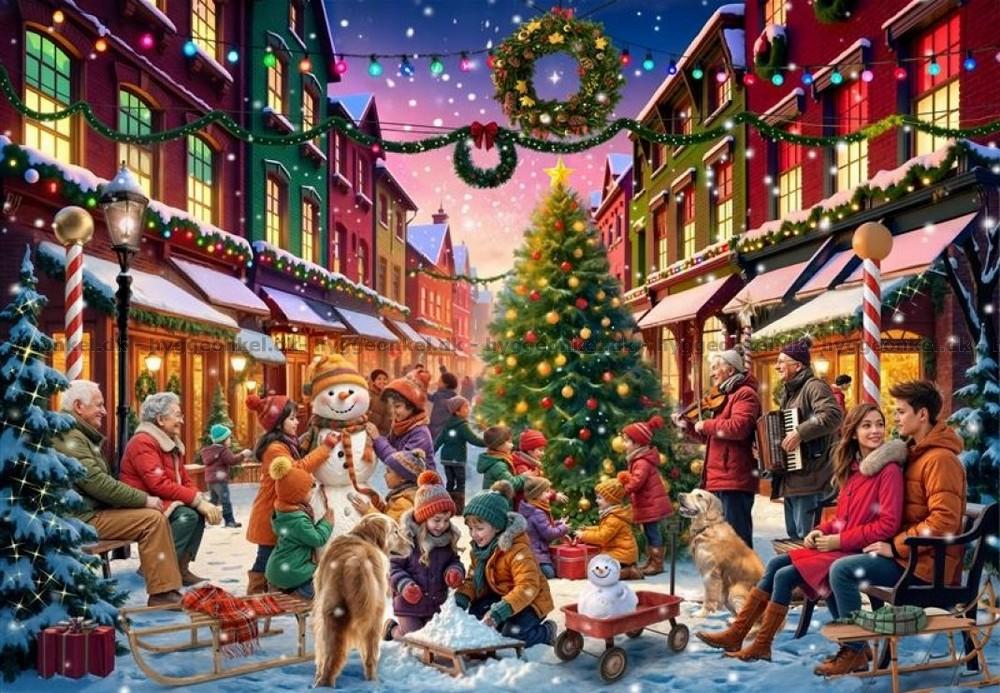 - En livlig julgata är fylld med människor som njuter av den festliga stämningen. Mitt på gatan står en stor julgran dekorerad med färgglada kulor och ljus. Barn leker i snön och bygger en snögubbe, medan en hund tittar nyfiket på.