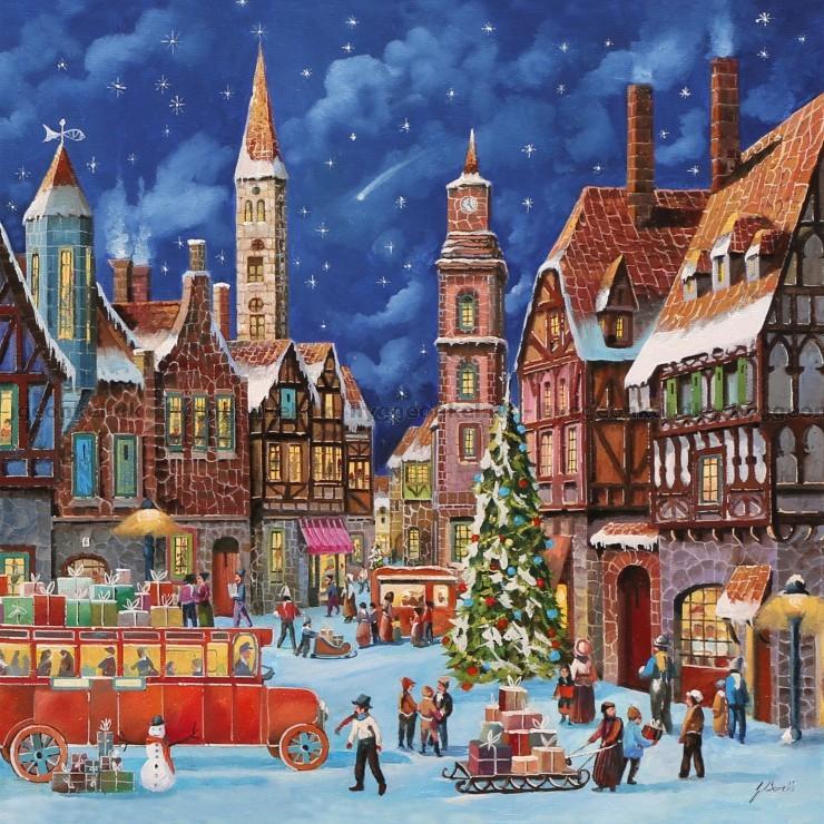 - På torget står en stor, dekorerad julgran omgiven av människor som njuter av den festliga stämningen