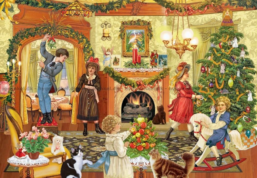 - Det mysiga vardagsrummet är fyllt med julpynt och glada människor som förbereder sig för julen. En stor julgran står dekorerad med färgglada kulor och girlanger. En man står på en pall och hänger upp mistel i en dörröppning, medan en kvinna tittar på med ett leende.