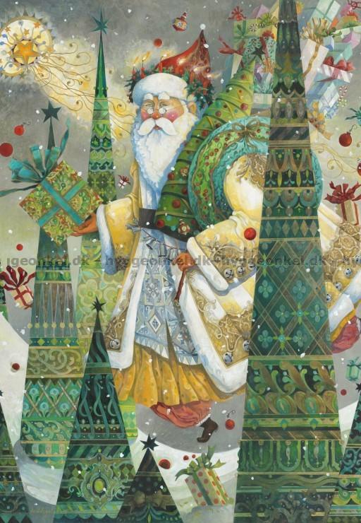 - Den färgglada jultomten står med en present i handen