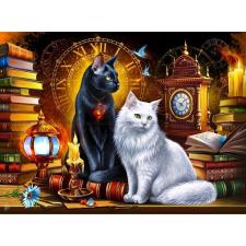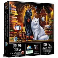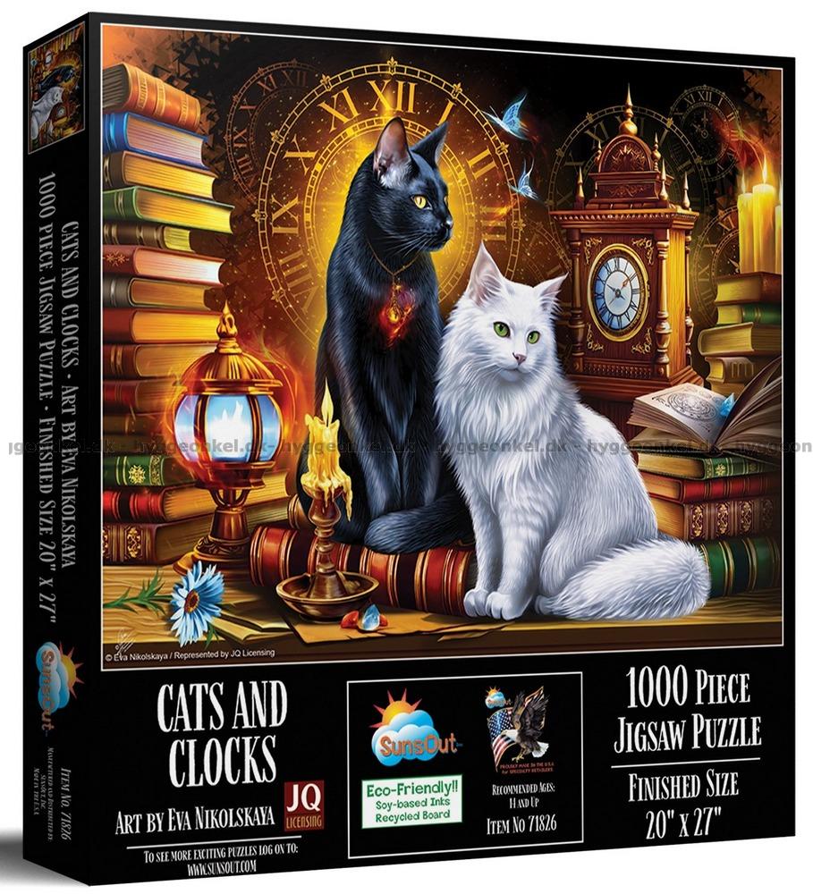 - Två katter sitter majestätiskt bland en samling böcker. Bakom katterna en stor urtavla med romerska siffror