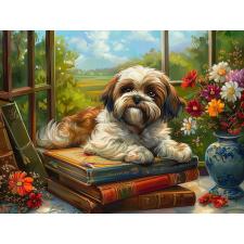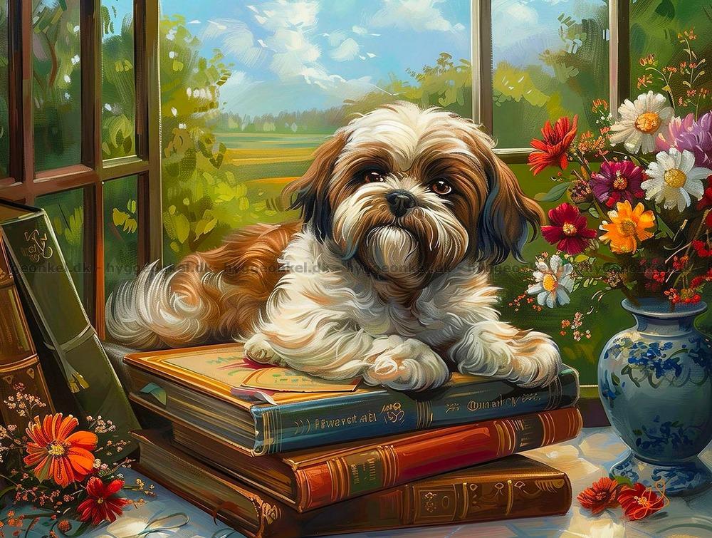 - En liten hund ligger avslappnad ovanpå en hög med böcker