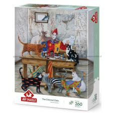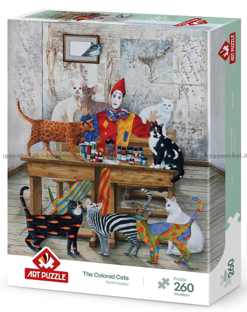 - Klovnen är omgiven av ett antal katter med konstnärliga mönster