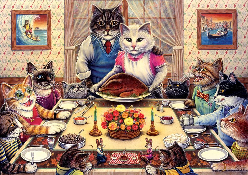 - Katterna har samlats till en festmåltid och det är fjäderfä på menyn.