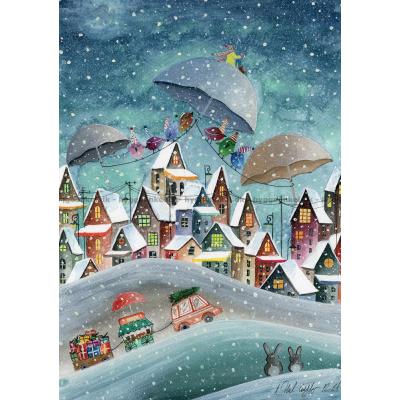 - Bilen drar en vagn fylld med presenter på väg mot den snötäckta staden