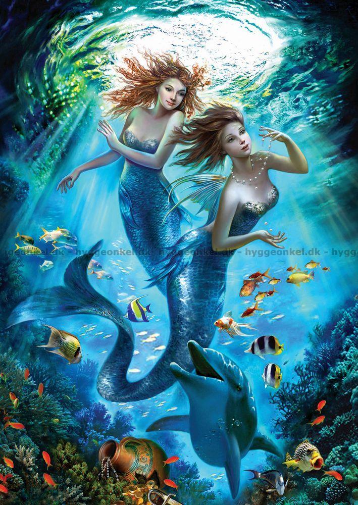 - Två vackra sjöjungfrur simmar elegant genom det klara blå vattnet. Runt dem simmar en färgstark samling tropiska fiskar