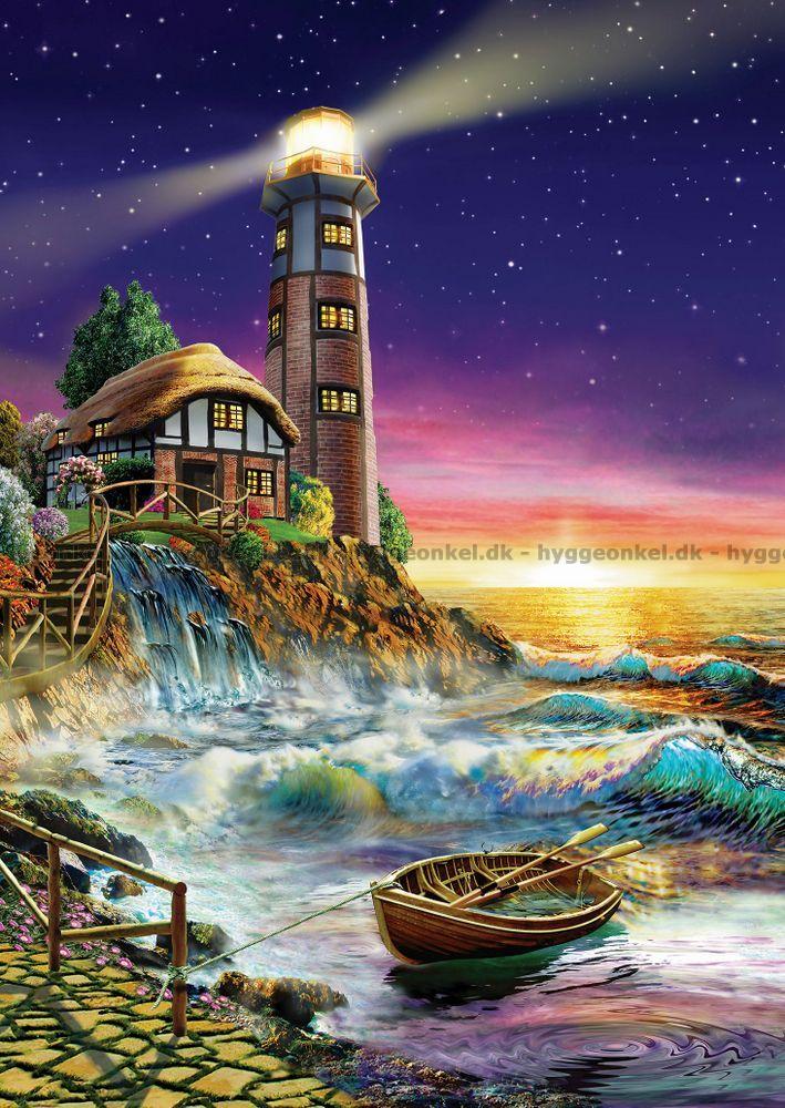 - Ett majestätiskt fyrtorn står stolt på klippan och kastar sitt ljus över det brusande havet. En liten roddbåt ligger förtöjd vid kusten, vaggande mjukt i takt med vågorna