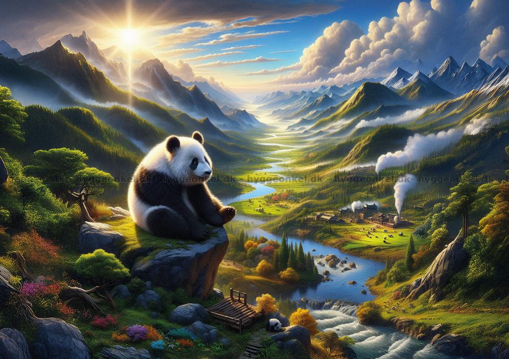 - Den stora pandan sitter majestätiskt på en klippa och blickar ut över ett hänförande landskap
