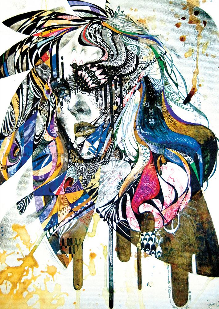 - Ett färgstarkt och abstrakt ansikte i en komplex sammansättning av färger och mönster