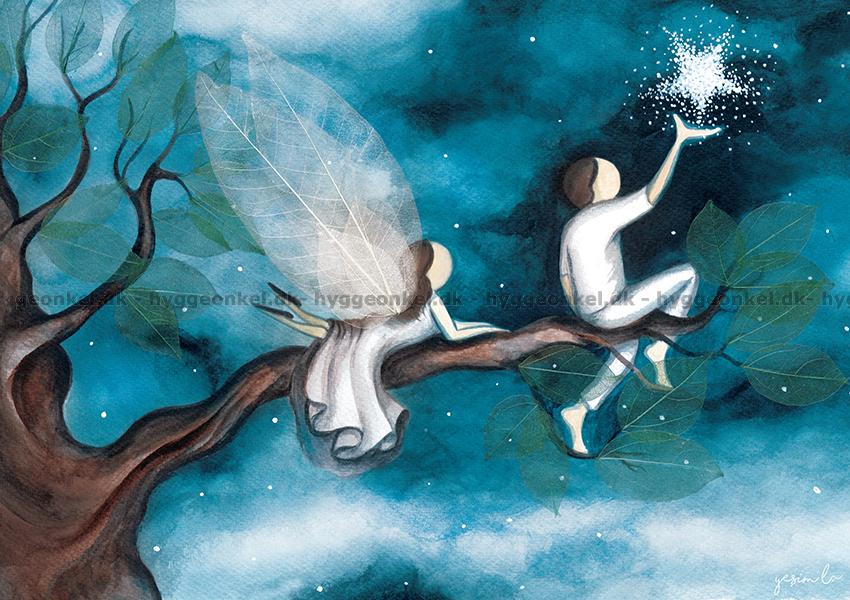 - De två figurerna sitter på en gren, omgivna av en drömlik natt-himmel