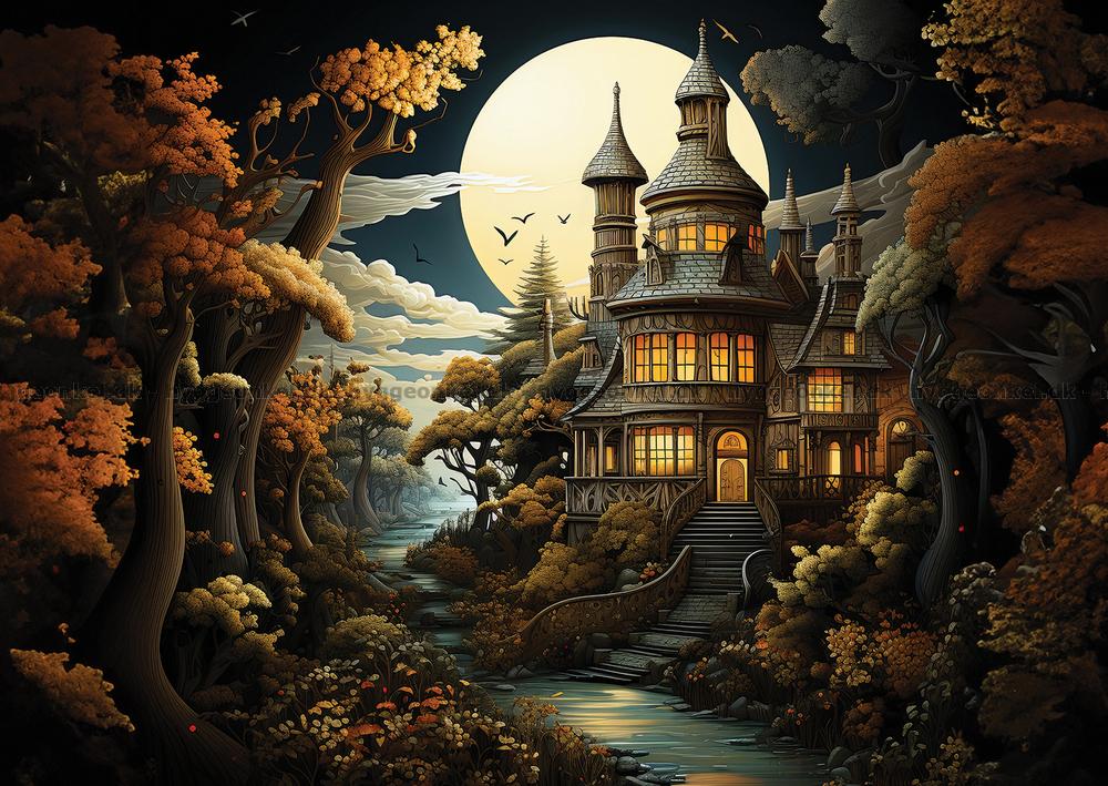 - En stor, lysande fullmåne hänger lågt på himlen, och dess sken speglas i de omgivande träden och den stilla floden som slingrar sig genom landskapet. Träden runt palatset är i varma höstfärger.