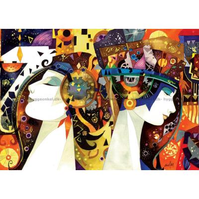 - Två färgstarka ansikten omgivna av spännande mönster och symboler