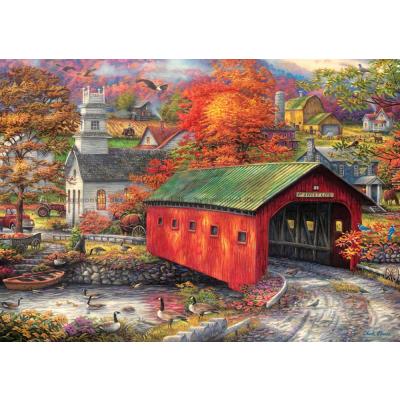 - Den röda bron sträcker sig över floden. Landskapet är täckt av gyllene höstfärger