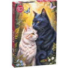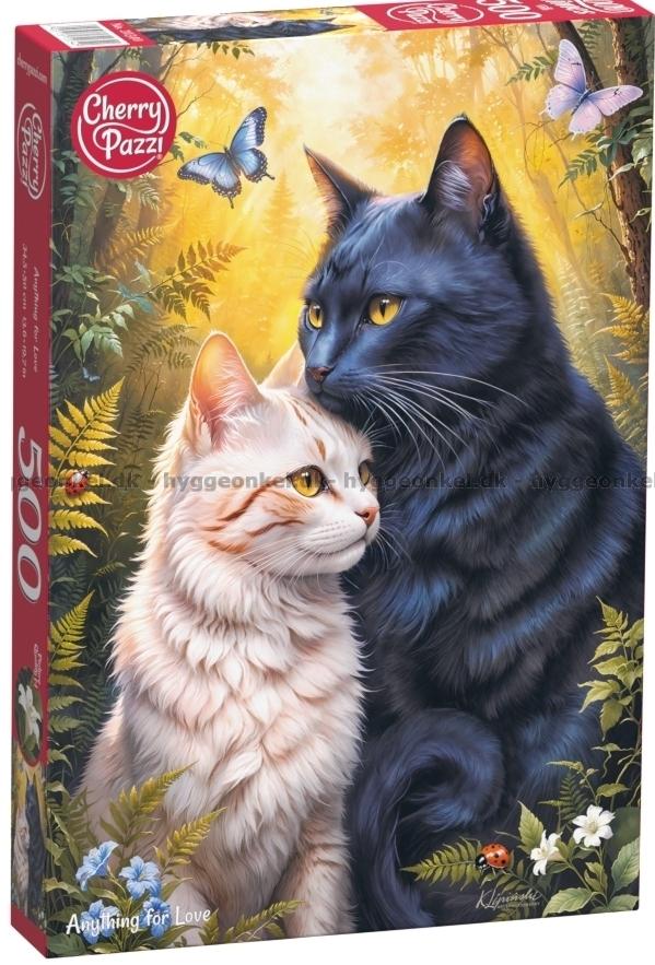 - Två katter sitter tätt tillsammans i en skogsglänta, omgivna av frodiga växter och mjuka solstrålar. Den ena katten är svart med glänsande päls, medan den andra är ljus med rödaktiga ränder.