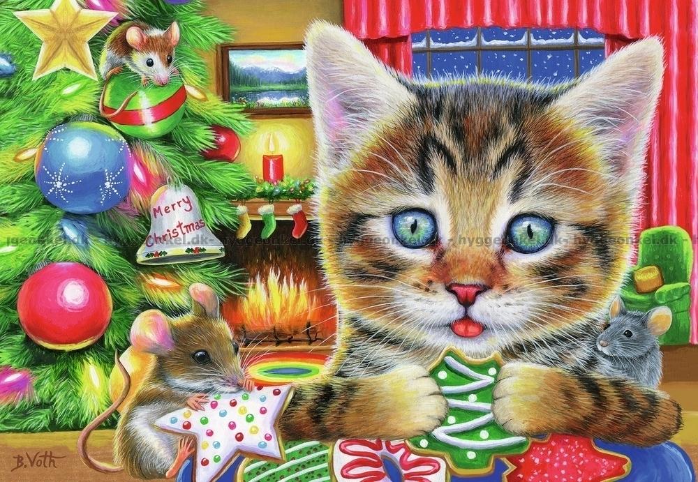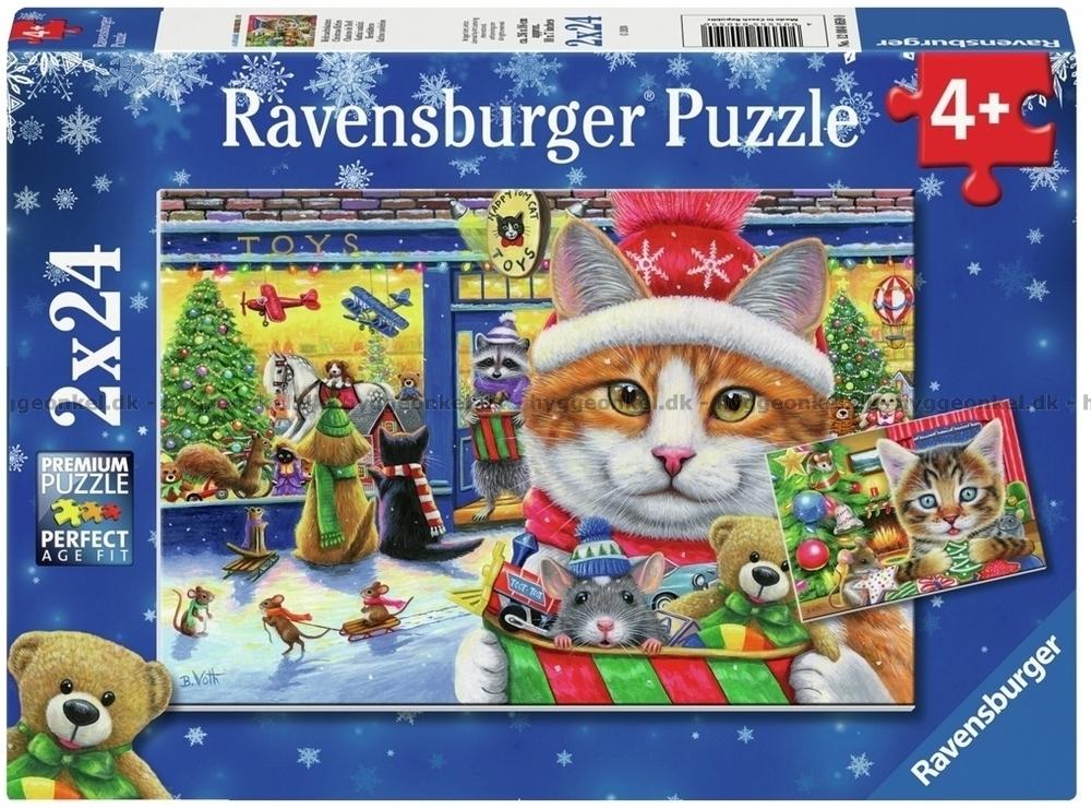 - På det ena motivet myser katten framför julgranen, medan det andra motivet visar katter på julshopping