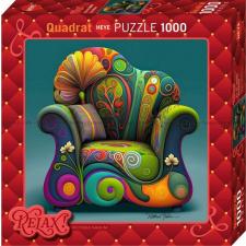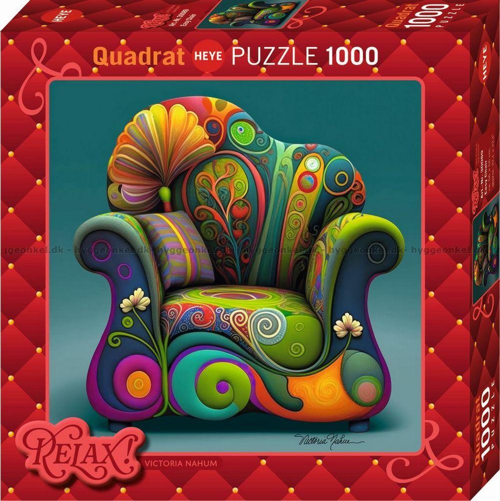 - Fåtöljen är dekorerad med en mängd färgglada och fantasifulla mönster. Ryggstödet är prytt med stora, blomliknande mönster