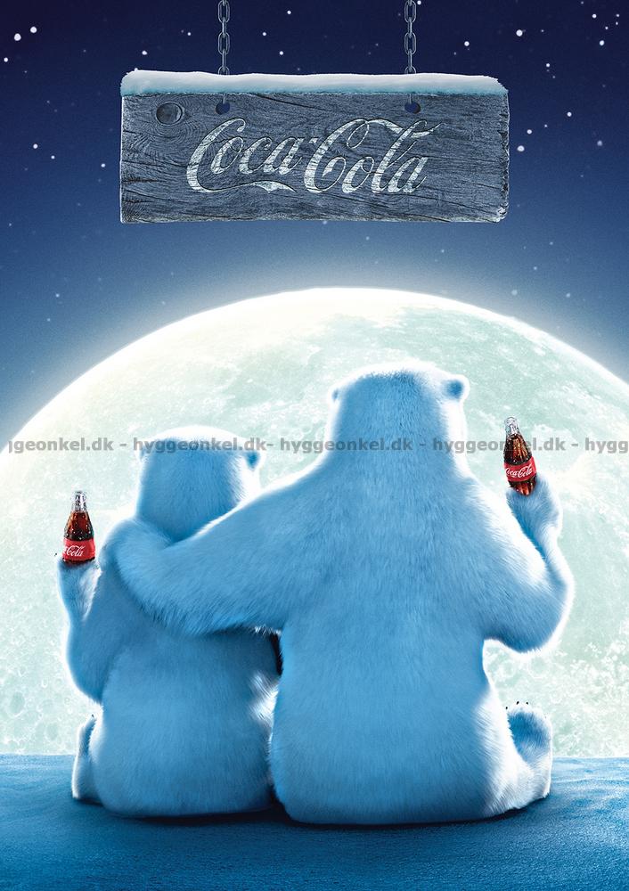 - Två isbjörnar sitter tätt tillsammans och njuter av en stilla stund under en stor, lysande måne. De håller varsin Coca Cola-flaska i tassarna.