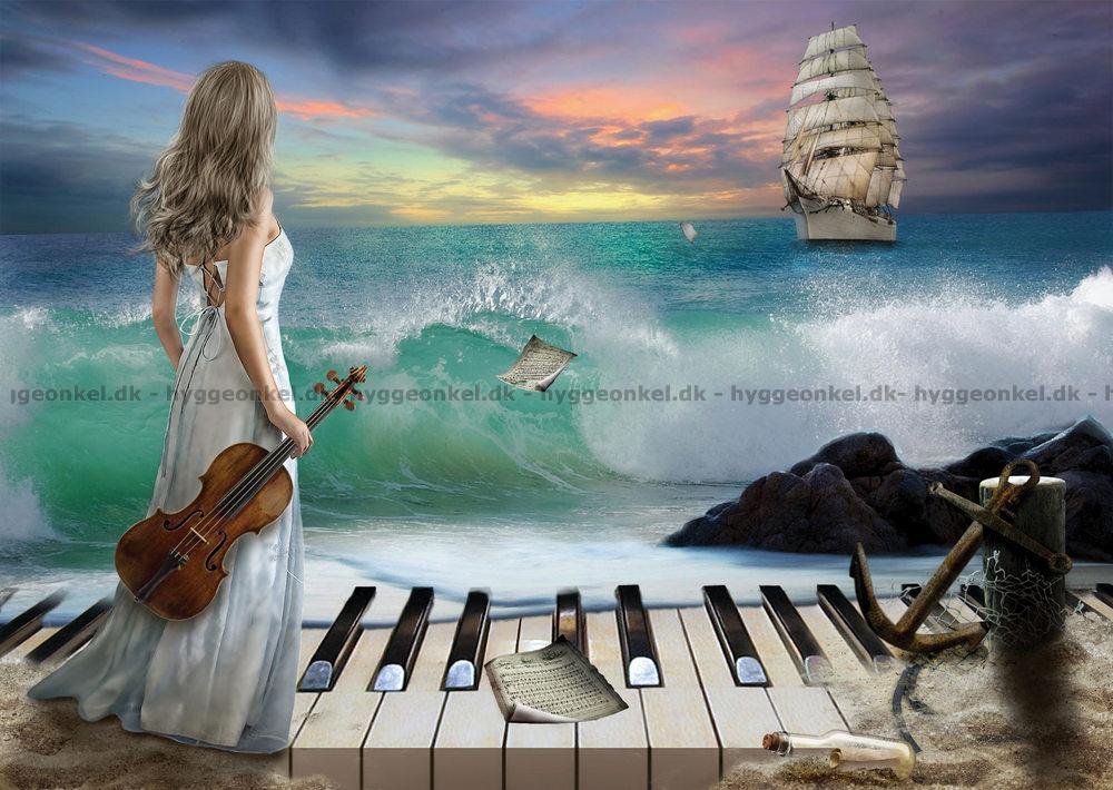 - Kvinnan står med fiolen i handen. Hon står på ett piano som är delvis begravt i sanden, medan hon blickar ut över havet.