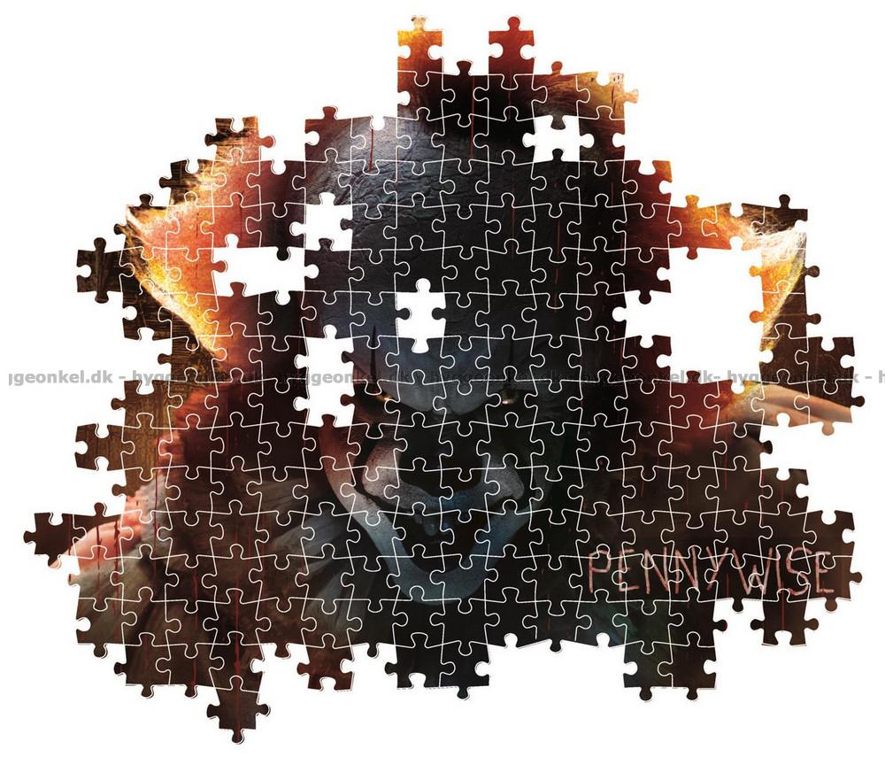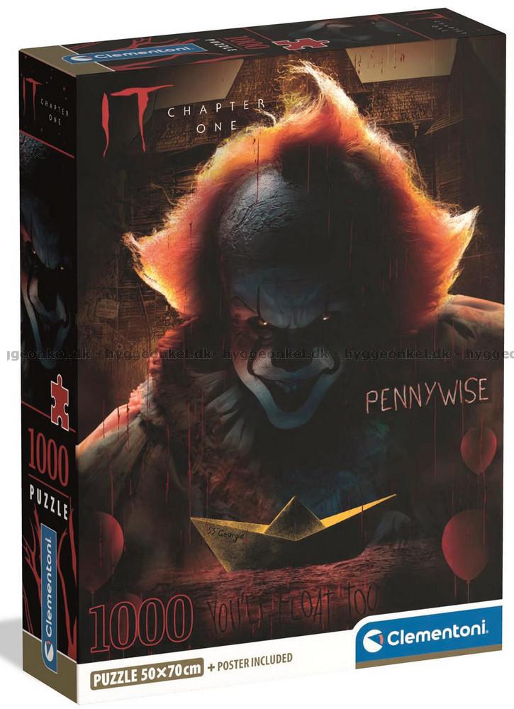 - Pennywise med sitt karakteristiska vita ansikte, röda målade linjer, gula ögon och det onda, leende uttrycket som gör honom så skrämmande