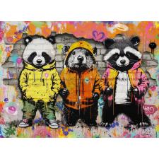 - Tre charmiga djur står sida vid sida framför en färgglad vägg