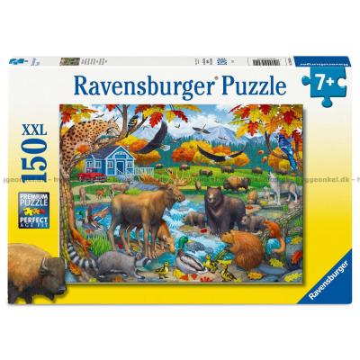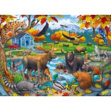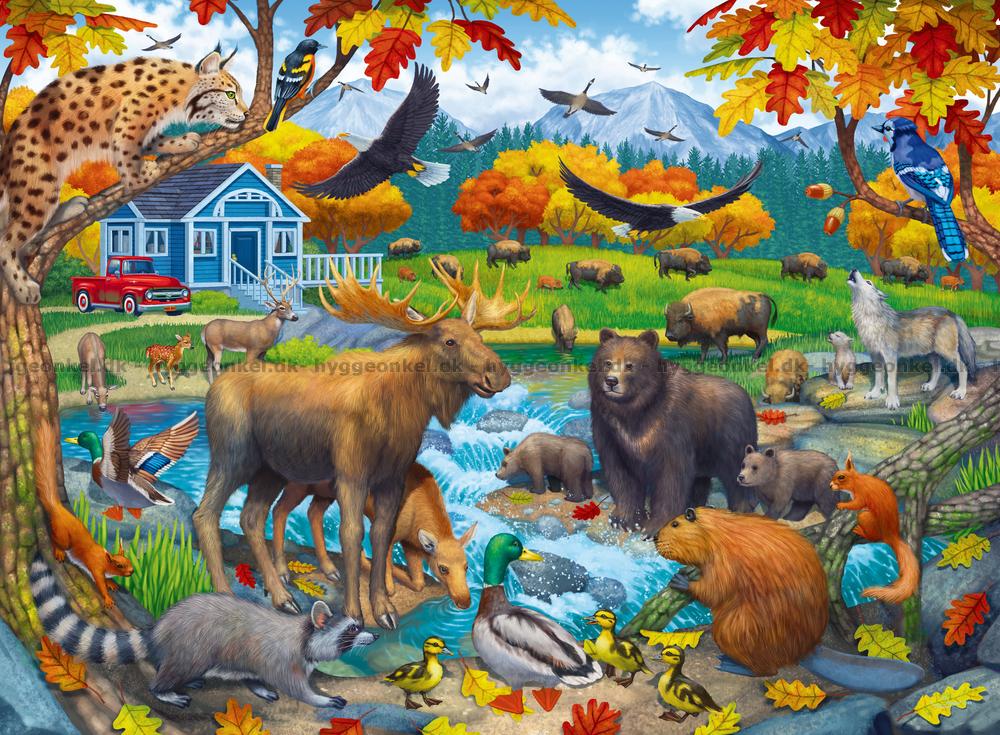 - En lång rad vilda djur står samlade runt en flod i höstfärger