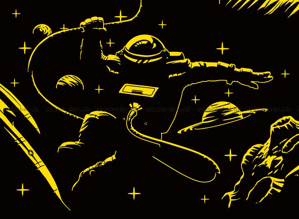 - Astronaut svävar genom det färgglada rymdlandskapet, omgiven av planeter och stjärnor