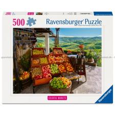 - En färgstark fruktmarknad med en fascinerande utsikt över gröna kullar i bakgrunden