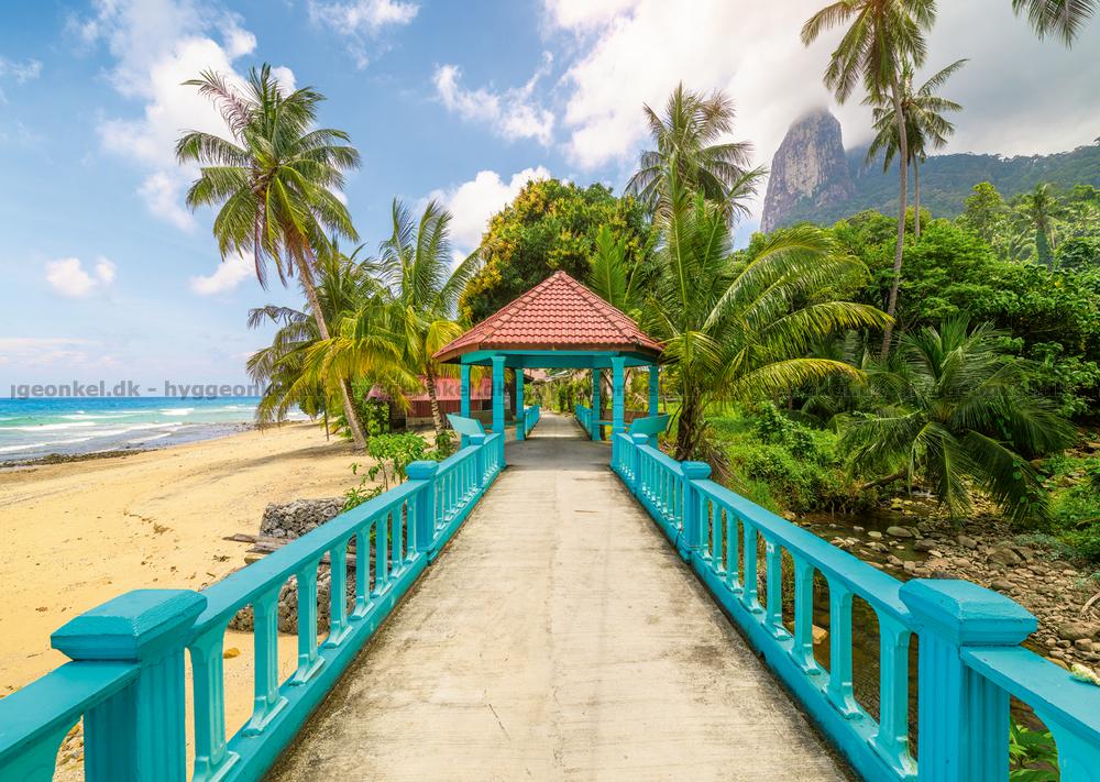 - Den färgglada bron leder genom en tropisk oas med palmer och frodig vegetation. Den blå bron står i kontrast till det gröna landskapet och den gyllene sandstranden