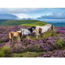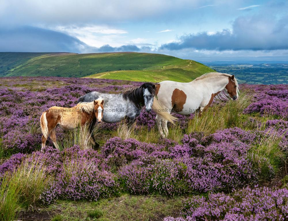 - Tre hästar står fridfullt på en äng täckt av lila ljung