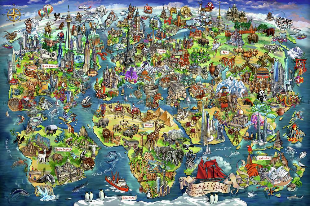 - Afrika är fullt av savannens djur som elefanter och lejon, samt de majestätiska pyramiderna. Asien visar en blandning av moderna skyskrapor och traditionella tempel, med pandor och tigrar. Maria Rabinsky har ritat motivet