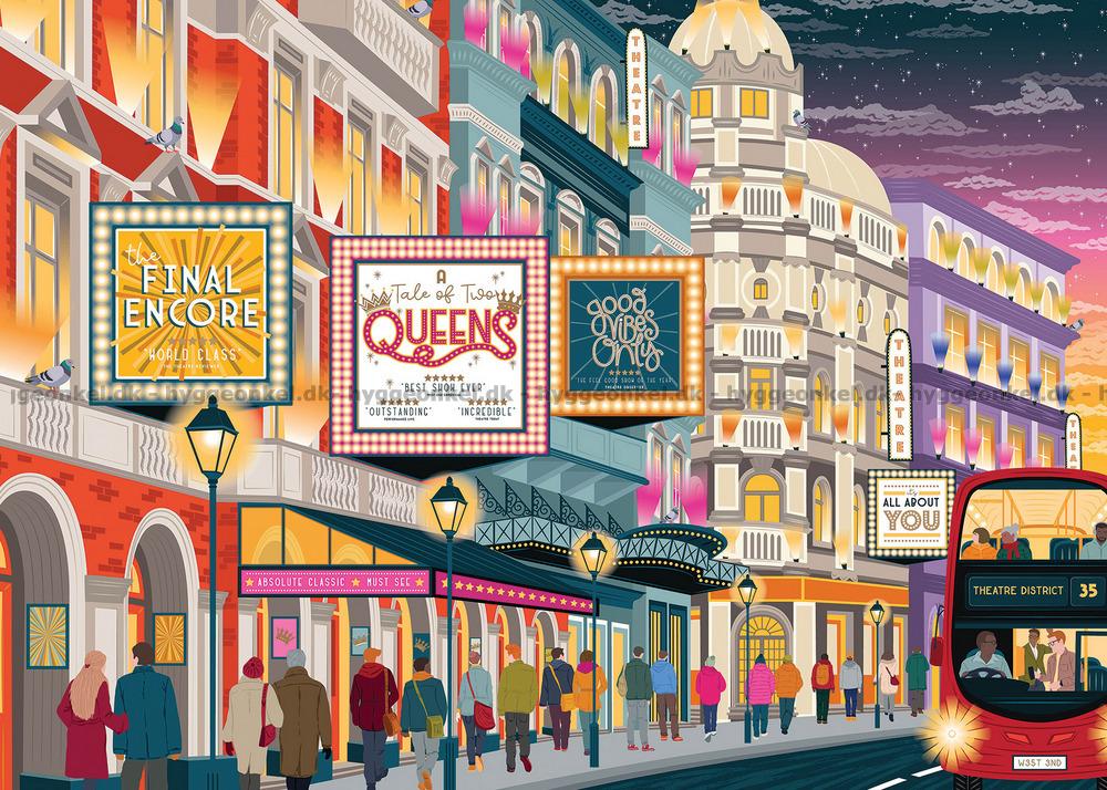- Gatan är upplyst av färgglada neonskyltar och gatlyktor. Folk är på väg till teatern