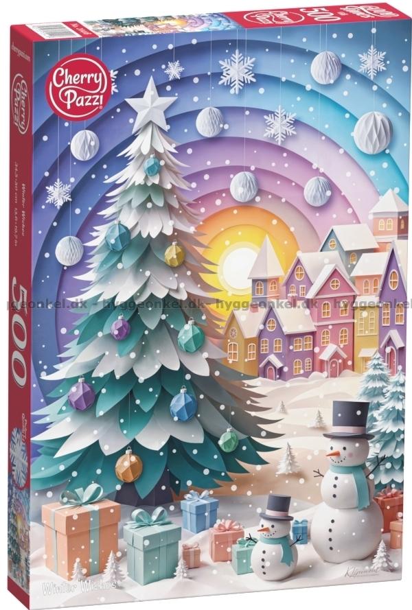 - Det magiska vinterlandskapet breder ut sig med snötäckta träd och färgglada hus i bakgrunden
