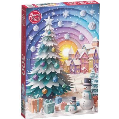 - En stor, pyntad julgran står i förgrunden, dekorerad med kulor i olika färger. Granen är täckt av ett tunt lager snö som glittrar i ljuset