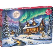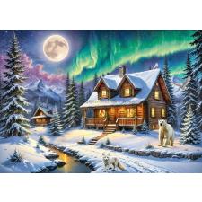 - Ett vackert vinterlandskap med en trästuga i förgrunden, upplyst av det strålande norrskenet på himlen
