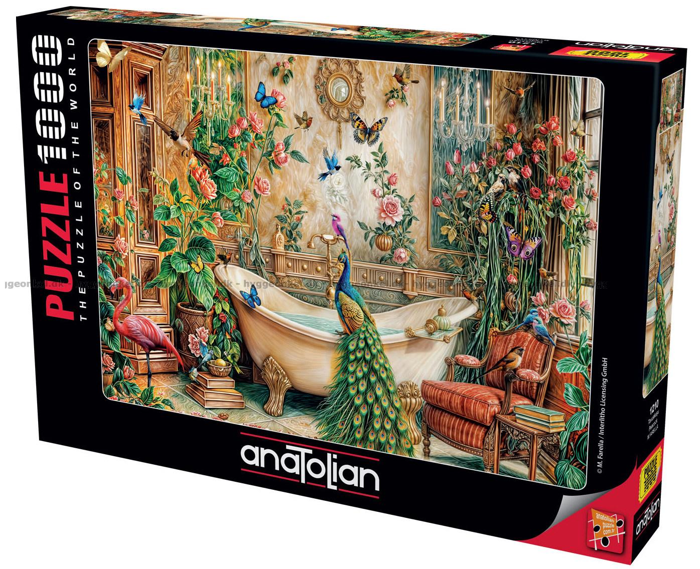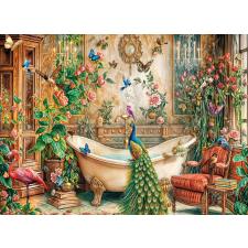 - Det överdådiga badrummet är fyllt med färger och liv. En majestätisk påfågel står vid ett elegant badkar, omgiven av blommor och fåglar