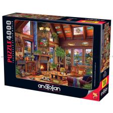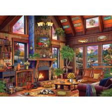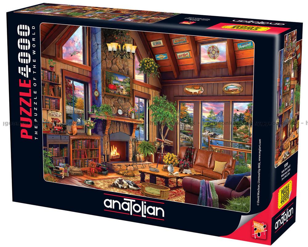 - I hyttan står en kamin med sprakande eld. Stora fönster ger utsikt över ett vackert landskap med berg och en sjö