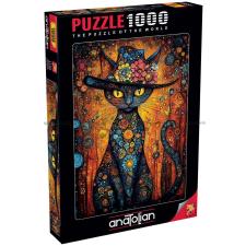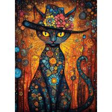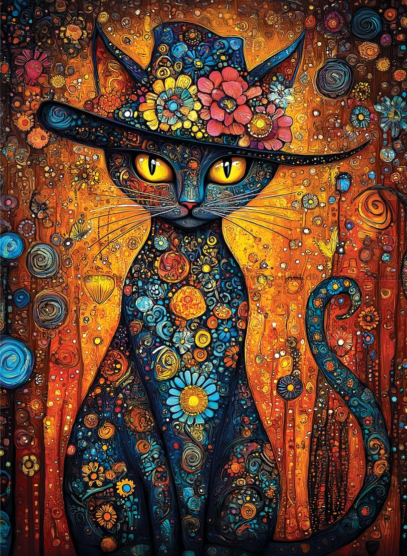 - Katten bär en bredbrättad hatt som är dekorerad med stora, färgglada blommor
