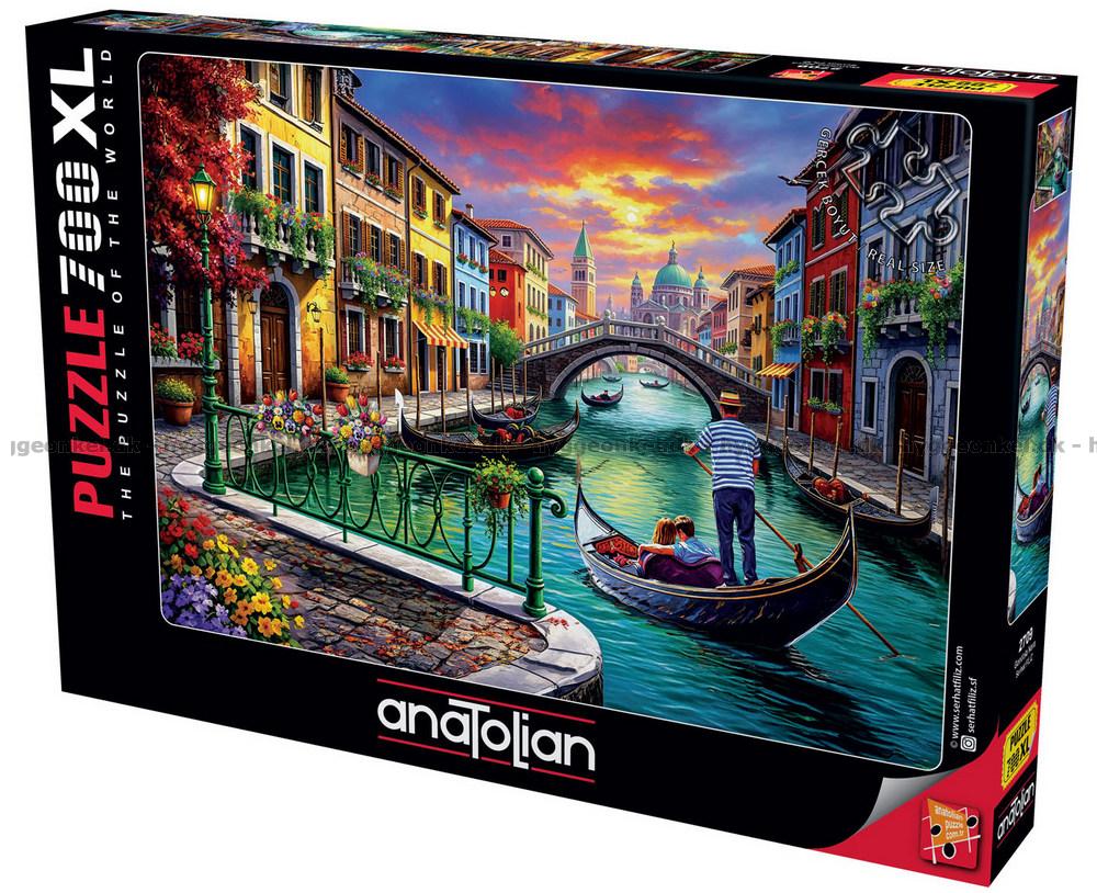 - Gondoler glider lugnt genom det smaragdgröna vattnet, medan himlen lyses upp av varma, gyllene nyanser