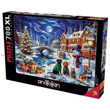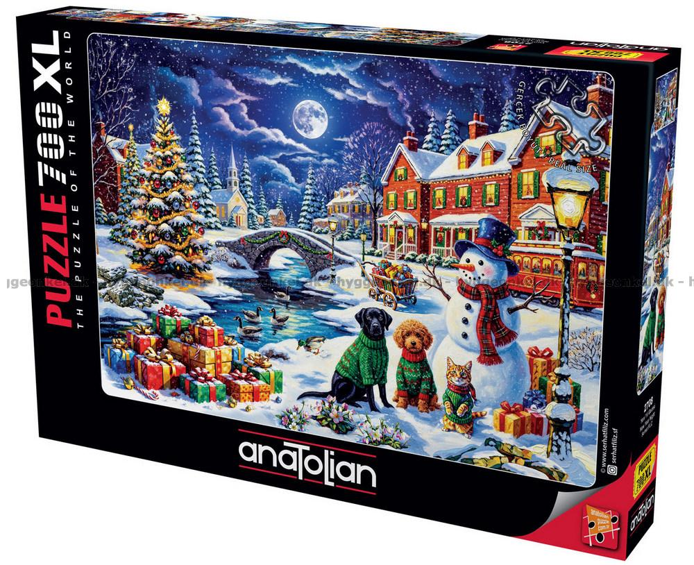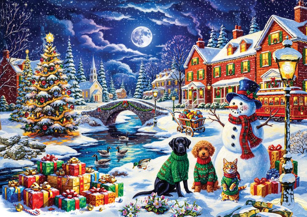 - Snögubben med den randiga halsduken är omgiven av härliga djur i stickade tröjor. Julgranen är pyntad med färgglada kulor och ljus. Under granen ligger en hög med inslagna paket.