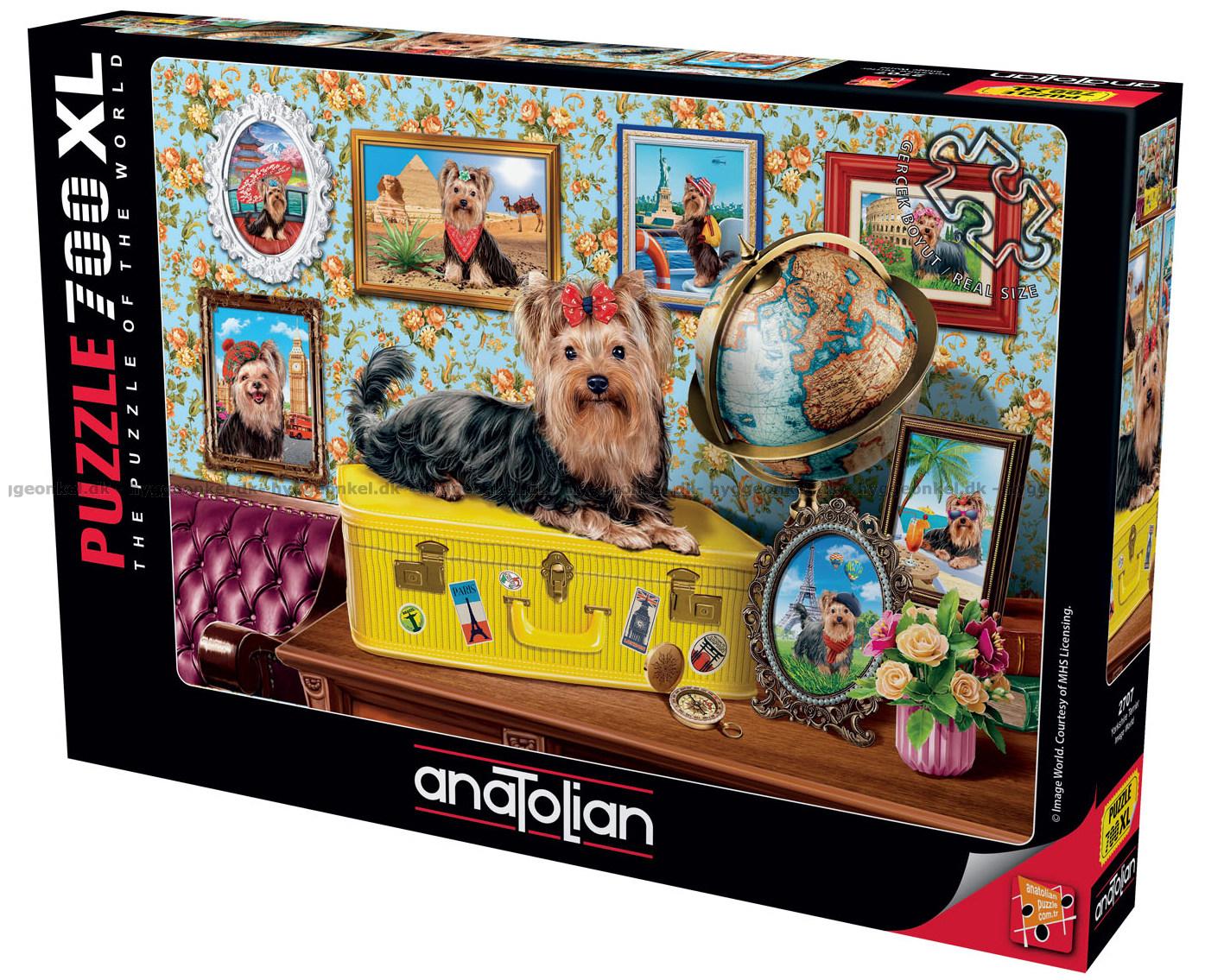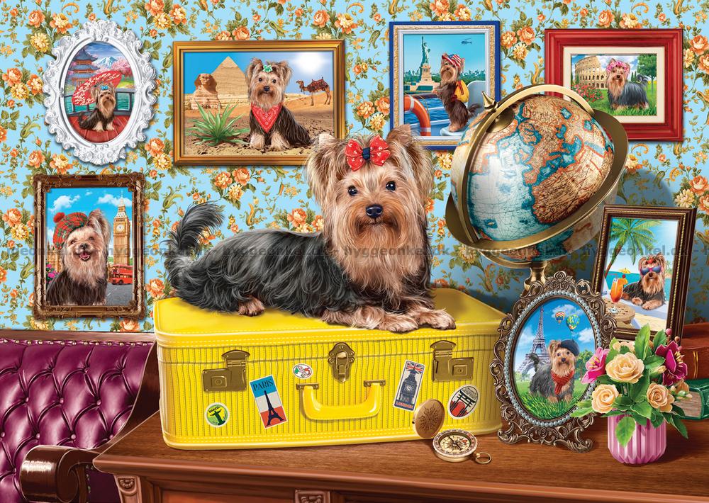 - Den charmiga Yorkshireterriern sitter på en gul resväska omgiven av reseminnen och bilder från hela världen