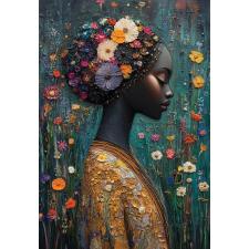 - Kvinnans hår är dekorerat med ett överflöd av blommor i olika färger