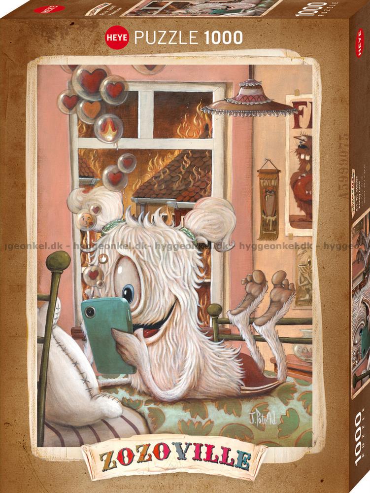 - Det lilla, håriga monstret ligger på sängen och följer intensivt med i meddelandena på telefonen