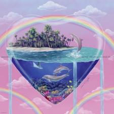 - Den svävande tropiska ön är omgiven av delfiner och regnbågar – allt inramat i en hjärtformad bubbla